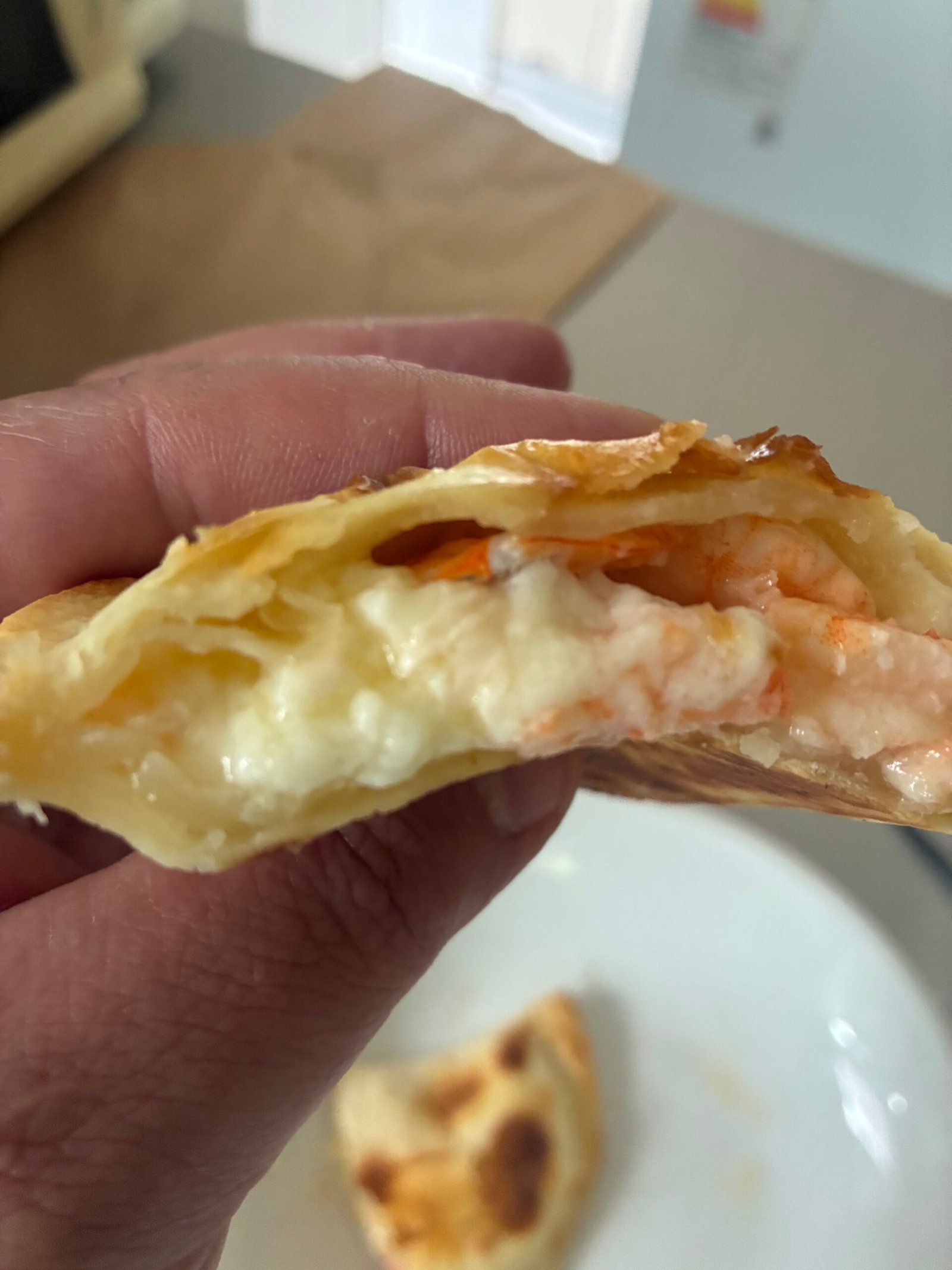 Empanada al horno rellena con queso Huentelauquén y abundantes camarones, cremosa y llena de sabor marino.